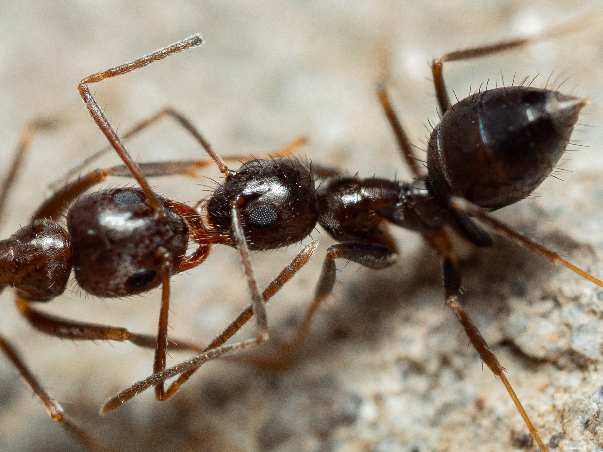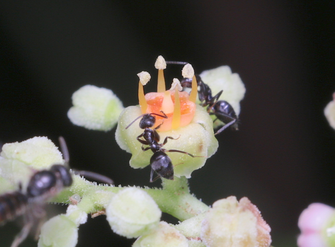 The Robust Crazy Ant is one of four widespread ants in Hawaiʻi that share the common name adjective “crazy”, the others being Yellow Crazy Ant, Longhorn Crazy Ant and Brown Crazy Ant. Seeing this unofficial term in an ant’s common name suggests one can safely infer that this ant tends to move around in a speedy, erratic manner. This ant tends to be very dark: almost or entirely black. It can be found from sea level up to at least 4000 feet elevation. It’s not aggressive towards people but is not above defending itself if it gets on you as you lounge at the beach: it doesn’t sting, but it will give a little nip if it starts to get squished in your clothing. It can be found just about anywhere, but seems to prefer the more humid environment of Maui’s north shore to our dryer, leeward areas. At beaches it often seems to be especially common just above the high-tide mark. As to their abundance and ecology, Huddleston & Fluker (1968) wrote: “Abundant to common in many different habitats. Nesting under rocks, in dead limbs and stalks, etc. Predaceous, also attending homopterous insects. Often observed feeding at extra-foliar nectaries of many plants.”