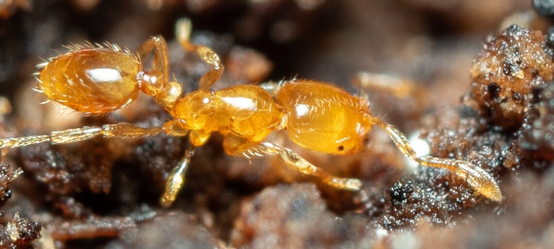 This ant garnered the common name “Overlooked Thief Ant” by failing to receive a scientific description until 1989 – this despite being a widespread ant in Florida, one of the most populous states in the U.S where many full-time entomologists have been combing the leaf litter for generations. Upon closer examination, however, and upon comparison to its many close cousins in that state, it’s more of a wonder that it got noticed at all: this is one of a group of a dozen of more virtually identical, tiny yellow ants. Even though it didn’t receive official recognition until 1989, it turns out that this ant had hitched a ride to Hawaiʻi two decades earlier: Huddleston & Fluker (1968) reported collecting it on Oʻahu. Thereafter, however, knowledge of its presence in Hawaiʻi faded from memory. Few people were paying close attention to Hawaiʻi’s ants from the 1970s to the 1990s, so it’s not clear if this ant managed to thrive. Curiously, a statewide survey in the 1980s and 1990s (Martin 2012) failed to detect it, however in 2000 it was rediscovered by Gruner et al. (2003), this time on both Oʻahu and Hawaiʻi. Perhaps the population(s) detected by Huddleston & Fluker died out, and a new introduction from imported Florida material in the 1990s resulted in the detections starting in 2000. In any case, by 2010 this ant was becoming widespread and common throughout the islands and today it is a firmly established member of our ant fauna.