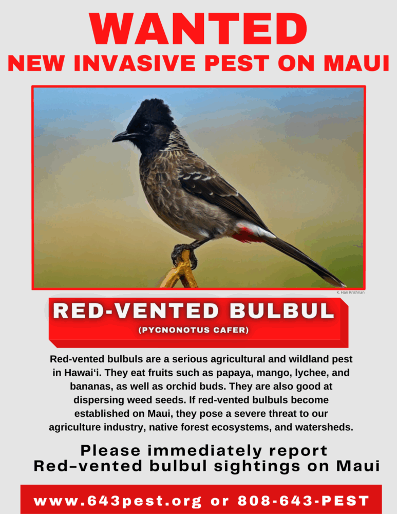 Agriculture and wildlife officials are raising concerns after a red-vented bulbul was spotted near Kā‘anapali. This high-priority invasive pest appears on the Hawai‘i Injurious Species list and the International Union for Conservation of Nature’s (IUCN) Top 100 Invasive Species list. The bird poses a serious threat to Maui’s agriculture as well as native ecosystems. To better determine the bird’s presence on Maui and develop an effective response strategy, MISC is asking the public to report any red-vented bulbul sightings immediately.